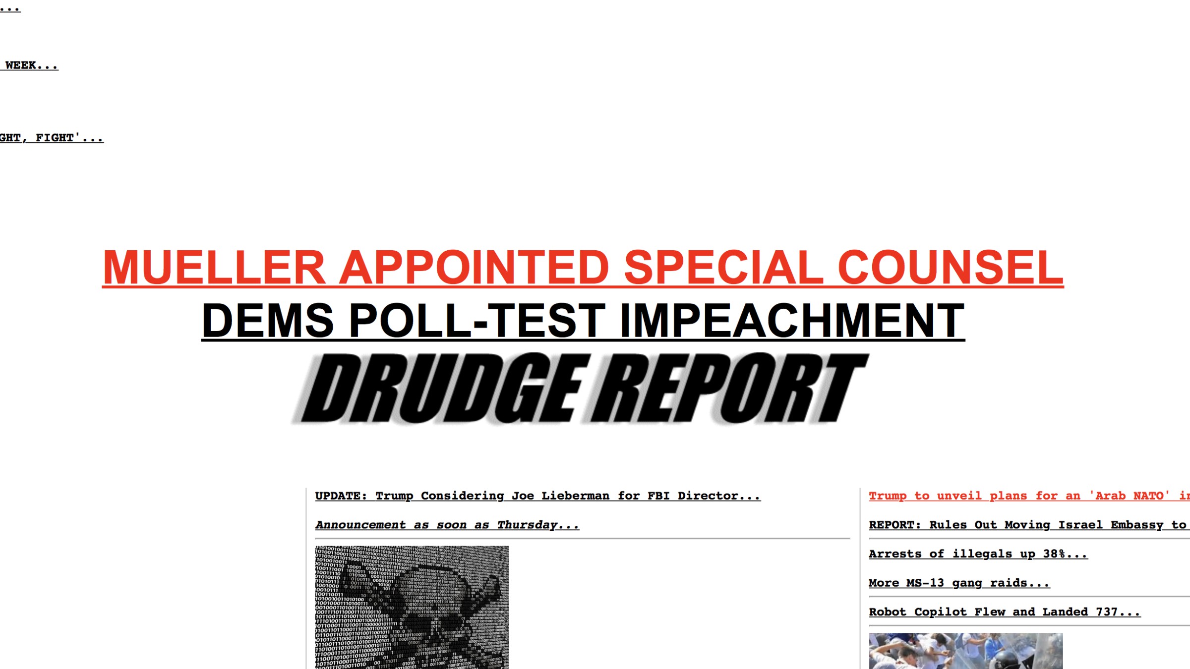 The Drudge Report blared these headlines late Thursday afternoon: “Dems Poll-Test Impeachment,” and “Mueller Appointed Special Counsel.”