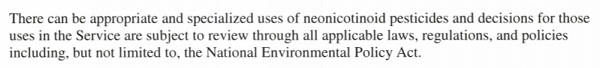 However, the original 2014 memo states that there will be exceptions granted on a case-by-case basis, stating, “There can be appropriate and specialized uses of neonicotinoid pesticides and decisions for those uses in the Service are subject to review through all applicable laws, regulations and policies including, but not limited to, the National Environmental Policy Act.”