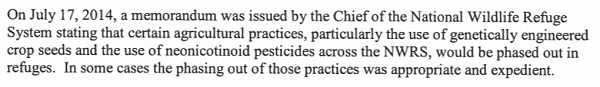 Again, the 2018 memo and the 2014 memo are essentially identical in their actual positions, both stating that GMOs and neonics can be used across National Wildlife Refuges on a “case-by-case basis.”