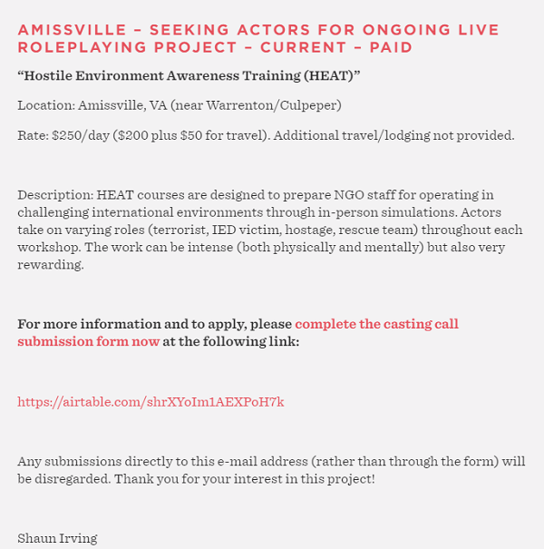Although the listing has now been removed after being discovered, crisis actors have been recruited for a “live roleplaying project” that pays $250 / day in Amissville, VA.