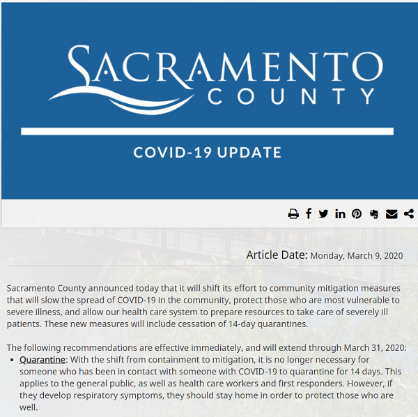 Sacramento County announced today that it will shift its effort to community mitigation measures that will slow the spread of COVID-19 in the community, protect those who are most vulnerable to severe illness, and allow our health care system to prepare resources to take care of severely ill patients. These new measures will include cessation of 14-day quarantines.