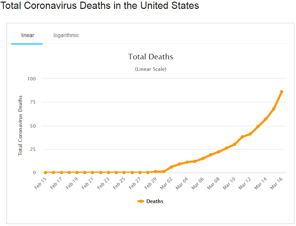 And here’s a chart of the rise in coronavirus deaths in the USA, via Worldometers.info: