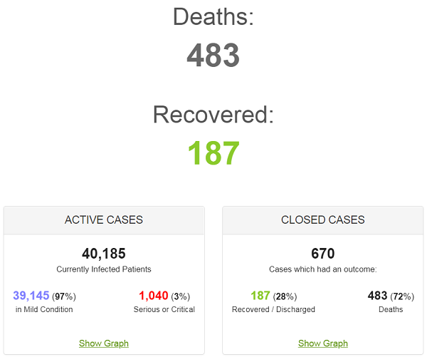 Out of the 670 coronavirus cases which have so far been closed in America, 483 have died. That’s a 72% case fatality rate. (187 have recovered)