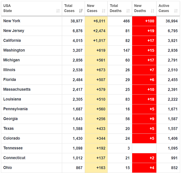 A look at the final numbers of new infections from yesterday, broken down by state, shows large increases in Michigan, Illinois, Florida, Massachusetts, Louisiana, Pennsylvania, Georgia, Texas, Colorado and other states. The column “New Cases” means new cases for just one day: