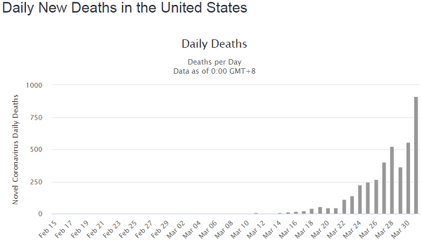 The following graph, from Worldometers.info, shows the daily death totals as of yesterday. Today, it’s over the 1,000 mark: