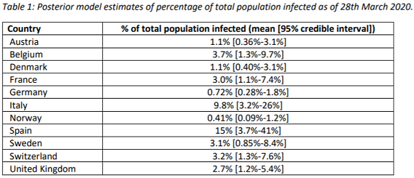The research finds that Spain already has around 15% of its population infected while Italy has just under 10% infected. Those are the high numbers. All the other nations are significantly lower, and Germany has just 0.72% of its population infected so far, which is one reason why hospitalizations and deaths in Germany have been so low. (The real calculated range for Germany, with a 95% certainty range, is 0.28% – 1.8%.)