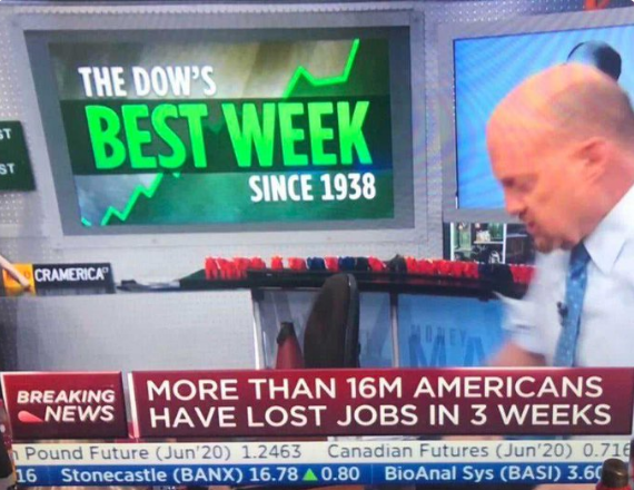 Here’s a visual representation of the total market insanity that has been unleashed. This viral photo captures CNBC broadcasting “The Dow’s Best Week Since 1938” while a ticket subhead declares, “More than 16M Americans have lost jobs in 3 weeks.” The disconnect is nauseating.