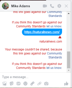 Here’s what happens when you try to share a Brighteon or NaturalNews link in a private message on Facebook: “this link goes against our community standards”