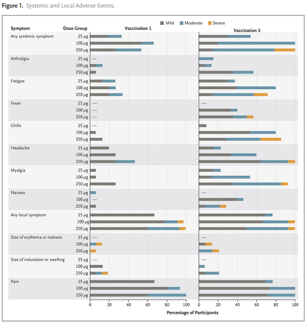 As you can see from the chart, 100% of study participants experienced side effects at the 100 ug or 250 ug injection volumes, during the second round of vaccination.