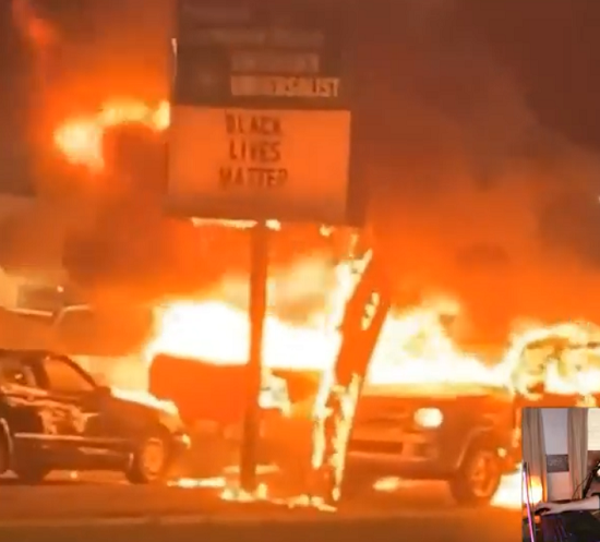Even local businesses that try to escape the arson and property destruction of BLM by posting “Black Lives Matter” signs end up in flames, as this photo from Kenosha shockingly shows: