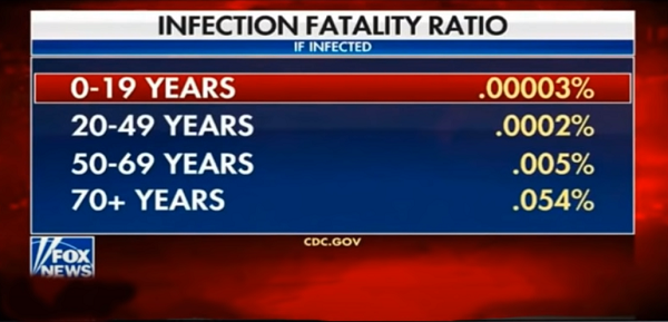 But Fox News, which is staffed by functionally illiterate “journalists,” reported the death rate for the 70+ age group as 0.054%. In other words, they just slapped a “%” sign onto the end of the fatality ratio numbers, with no understanding of the CDC’s reported numbers. A death rate of 0.054% means it only kills 1 in every 1,850 people, and that’s off by two orders of magnitude.