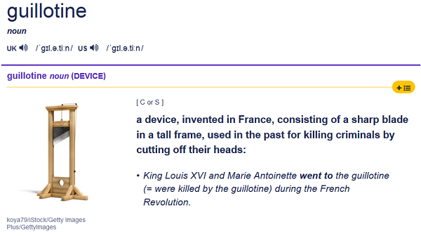As the Cambridge online dictionary explains, “guillotine” is a device that’s used to kill people by cutting off their heads: