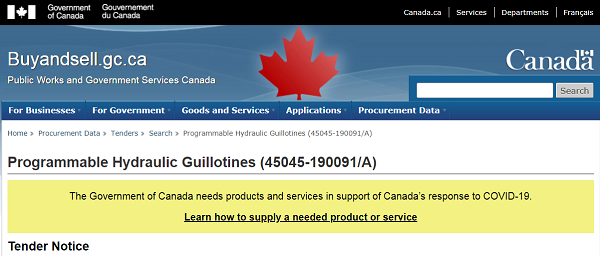 The “Programmable Hydraulic Guillotines” listing on the Canadian government’s website is explained on the site as “products and services in support of Canada’s response to COVID-19.”
