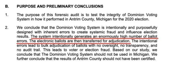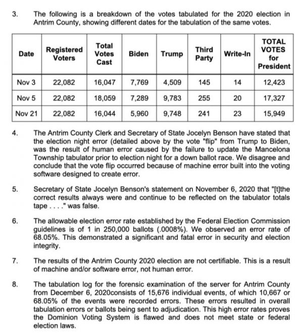 The report shows the change in the vote totals on Nov 3, Nov 5, and Nov 21. Paragraph 7 states: “The results of the 2020 Antrim County election are not certifiable. this is a result of machine and or software error, not ‘human error,'” as previously stated by Secretary of State Benson on November 6, which DePerno calls, “false.”