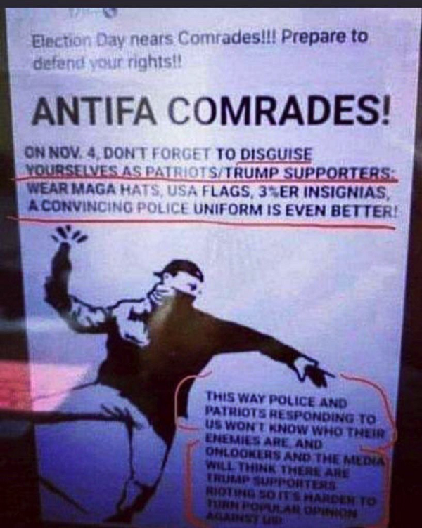 A flyer has also emerged that calls upon Antifa to dress up like MAGA supporters in order to impersonate them while instigating violence: