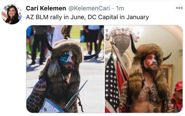 Update: We have now confirmed that the storming of the Capitol Building was initiated by left-wing provocateurs who met with Capitol Police yesterday and planned the event. A photo has emerged of the “Viking” individual who led the storming action today (shown on the right side of the photo below). This same person — wearing the same outfit and nearly identical face paint — was also reportedly spotted at a BLM rally earlier this year.