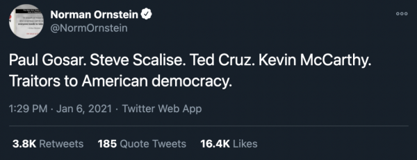 Throughout the piece, Ornstein – who spent January 6th calling Republican Congressmen “traitors” – uses words such as “dysfunctional,” and phrases such as “a decline in institutional loyalty,” to attack the U.S. Congress. He accused legislators of “declining to govern,” and concluded “we can look forward to more headaches ahead at home and abroad.”