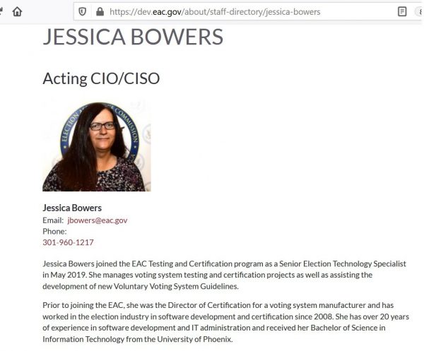 Notably, the EAC doesn’t mention Dominion in Bowers’ bio, just some ‘voting system manufacturer’.