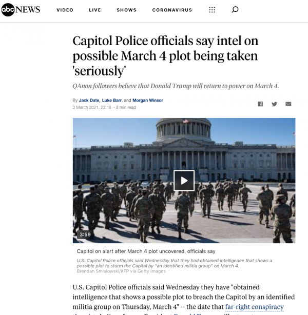 This March 4 paranoia was not confined to NBC’s resident millennial hall monitor and censorship advocate. On March 3, The New York Times warned that “the Capitol Police force is preparing for another assault on the Capitol building on Thursday after obtaining intelligence of a potential plot by a militia group.” All this, said the Paper of Record, because “intelligence analysts had spent weeks tracking online chatter by some QAnon adherents who have latched on to March 4 — the original inauguration date set in the Constitution — as the day Donald J. Trump would be restored to the presidency and renew his crusade against America’s enemies.”