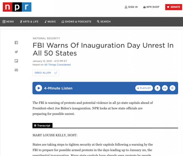 These dire warnings also, quite predictably, generated serious reactions. “House leaders on Wednesday abruptly moved a vote on policing legislation from Thursday to Wednesday night, so lawmakers could leave town,” said the Times. We learned that there would be further militarization of the Capitol and troop deployment in Washington indefinitely due to so-called “chatter.” NPR announced: “The House of Representatives has canceled its Thursday session after the U.S. Capitol Police said it is aware of a threat by an identified militia group to breach the Capitol complex that day.”