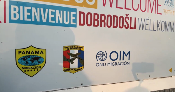 “Welcome” sign featuring multiple languages from around the world. In Espanol, it says “Migration reception station of San Vicente.”