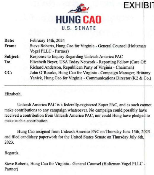 In a email response to USA Today author Elizabeth Beyer, general counsel for Hung Cao for Virginia, Steve Roberts, wrote the following (February 14, 2024):