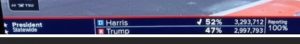 The cheat is on. The fix is already in. ABC, NBC, CBS, CNN and most likely even Fox News and Breitbart, just like four years ago. (Remember, they too supported the fake news numbers on election night and the days following, never protesting.) Take a look at the bottom of the screen, where fake news shows Harris already won the election with 3,293,712 votes, “reporting 100 percent” of the votes already in, having already beat Trump by almost 300,000 votes (just in case they’re “off” a little).