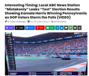 It’s over. The election in Pennsylvania has already been decided for Kamala, and all votes have been counted, according to mainstream media fake news. According to ABC news in Pennsylvania, Kamala Harris has already won the state with 100 percent of the vote counted, as reported on television during a Formula 1 race more than a week ahead of the actual election day of November 5th. That’s right, this is prior to the election coming up next Tuesday, as the Democrats and their FAKE INDUSTRIAL NEWS COMPLEX have already prepared the FAKE numbers for the “final count,” and anyone who disagrees will be sent directly to the DC gulags with the rest of the election “deniers” from January 6th, four years ago.