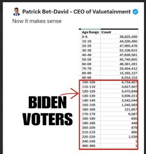 Next on the docket we have over 3.6 million dead voters between the ages of 110 and 119, who all voted for Demented JB, the child-hair-sniffing pervert who opened up our borders and terrorized American citizens for 4 long years.